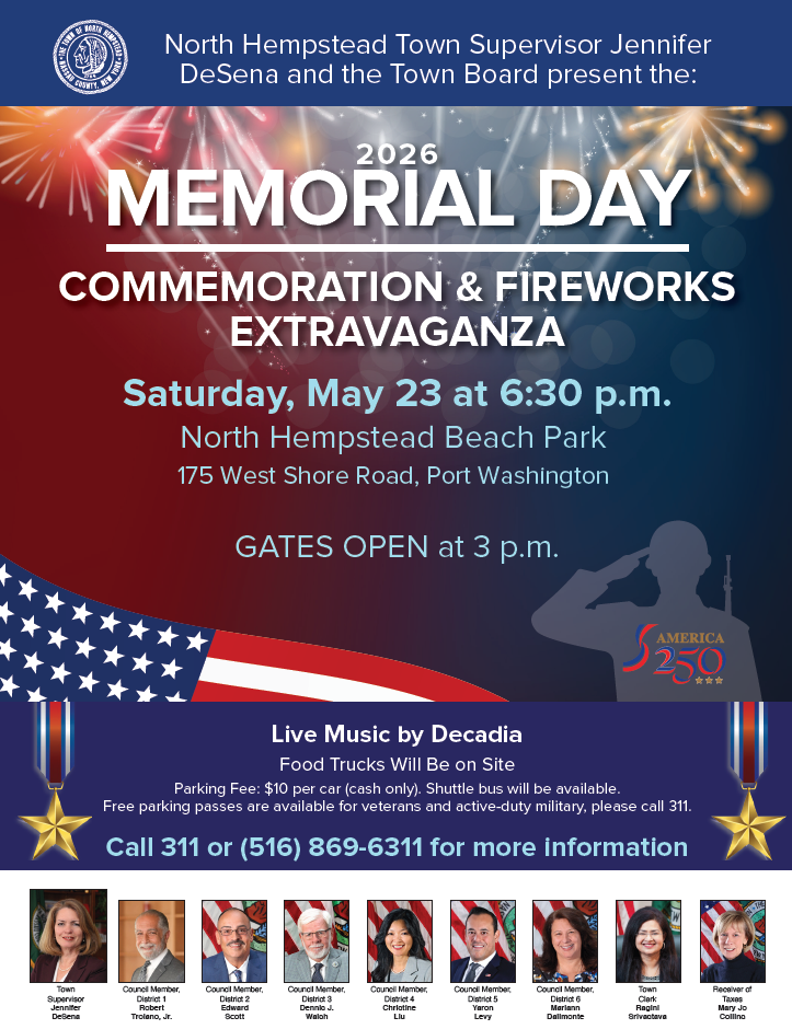 A rousing celebration of America's 250th Anniversary and a hometown tribute honoring America's fallen heroes. Veterans: contact the Parks Department for special recognition at the event — (516) 869-6311. View flyer →